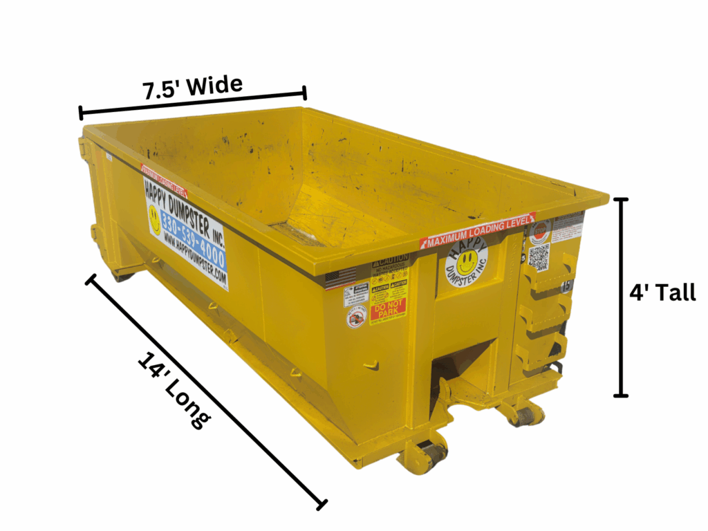 Some projects require more muscle, and our 15-yard is up to the task. This large roll-off dumpster is popular with property managers. And our 15-yard has a capacity of up to 65 square of shingles. This size is excellent for contractors’ demo materials on a larger project or a homeowner with a basement or garage cleanout. This dumpster is extendable with 48 hours’ notice, which can be provided by texting or calling. See our rental terms page for details.